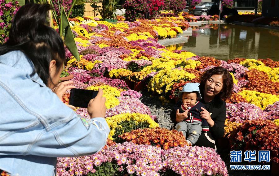 10月8日,在大厂回族自治县小厂村,游客在菊花展上拍照留念。新华社记者 王晓 摄