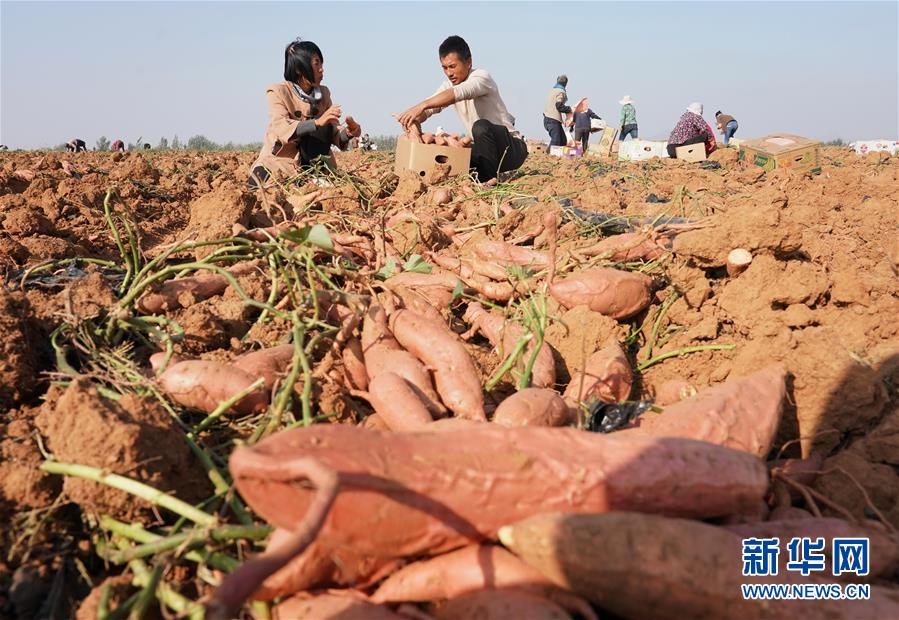 10月8日,高清喜(右)与爱人一起在田间收获鲜食型红薯。 河北省卢龙县石门镇农民高清喜2011年引进鲜食型红薯新品种,试种成功后开始逐年扩大种植面积,如今红薯种植面积约2500亩,年产优质鲜食型红薯500多万公斤。高清喜也成为当地有名的“红薯状元”,带动周边200多名村民实现稳定就业,致富增收。 新华社记者 杨世尧 摄