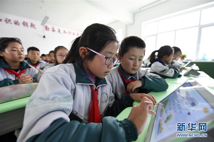 10月9日,宁夏固原市泾源县第四小学的学生在课堂上使用平板电脑。 新华社记者冯开华摄