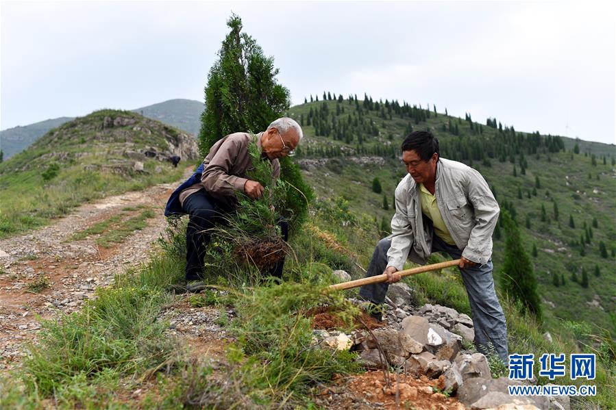 在山西省芮城县虎庙山,高文毓(左)和儿子高立星在山上种树(7月18日摄)。 新华社记者 詹彦 摄