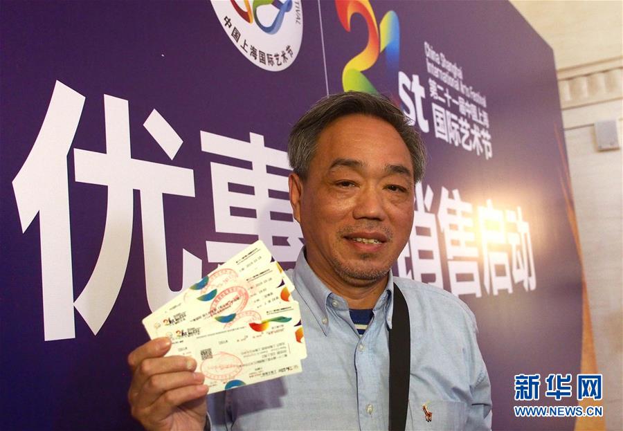 10月10日,市民王福庆展示他买到的艺术节优惠票。他从9日上午就在上海美琪大戏院门口开始排队,成为第一个购票的观众。 当日上午,第二十一届中国上海国际艺术节优惠票在全市18个社区销售点启动首轮统一发售。此次优惠票涵盖了本届艺术节参演剧目、“艺术教育”演出、“艺术天空”室内演出部分及上海共青森林音乐节户外演出等内容,节目类型丰富多样,票价从20元到200元不等,票量占演出项目总票量的10%。 新华社记者 任珑 摄