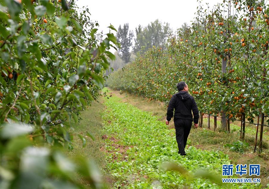 10月9日,在河南省洛宁县马店镇关庙村,李应贤在查看金珠果梨生长情况。新华社记者李嘉南摄