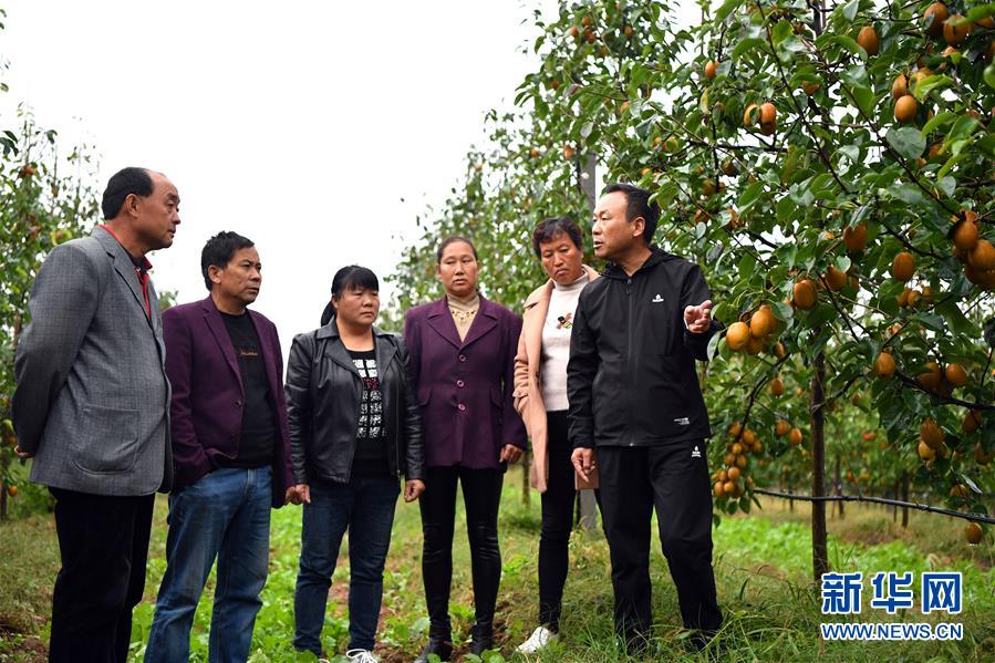 10月9日,在河南省洛宁县马店镇关庙村,李应贤(右一)为当地村民讲解金珠果梨种植技术。新华社记者李嘉南摄