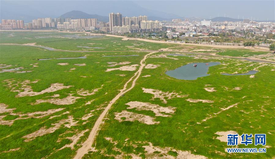 这是江西省庐山市鄱阳湖湖区干涸的情况(10月9日无人机拍摄)。 记者从江西省水利厅获悉,7月下旬至10月初,江西省平均降雨量为96毫米,比多年均值偏少约七成。持续的少雨天气导致江西省主要江河水位持续走低,多地因此出现不同程度的旱情。 新华社记者胡晨欢摄
