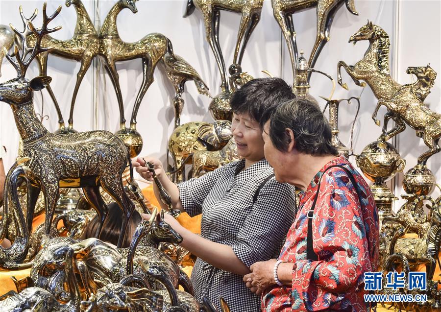 参观者在第十六届中国—东盟博览会上选购外国工艺品(2019年9月23日摄)。新华社记者 曹祎铭 摄