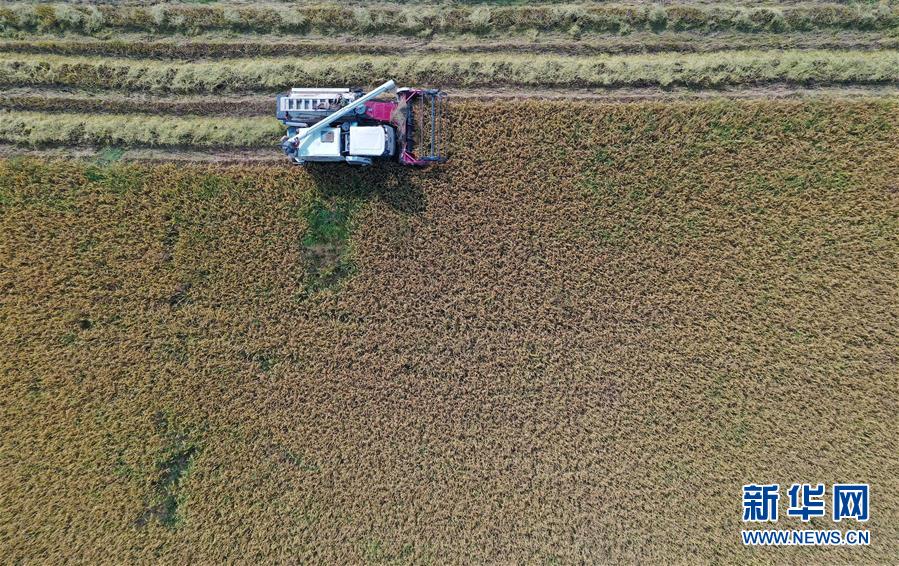 10月10日,在江西省南昌市南昌县蒋巷镇,当地农户驾驶收割机收获中稻(无人机拍摄)。新华社记者彭昭之摄