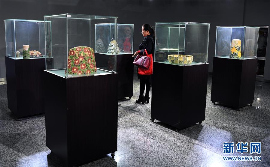 参观者在江西景德镇美术馆参观“笠间烧”日本陶艺家的作品展(2018年10月19日摄)。新华社记者 万象 摄