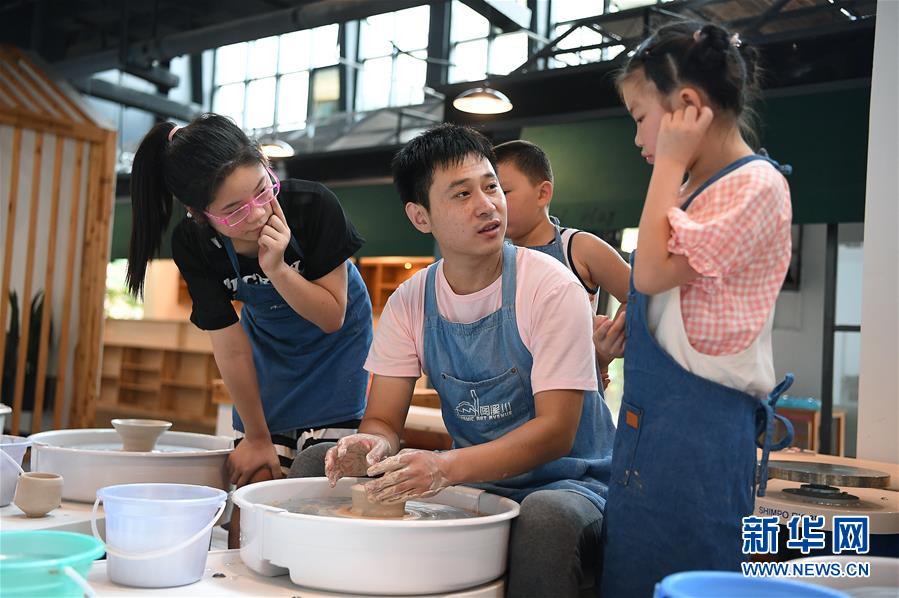 在江西景德镇陶溪川文创街区的陶公塾实训基地,孩子们在老师(中)的指导下制作陶艺作品(7月26日摄)。新华社记者 万象 摄