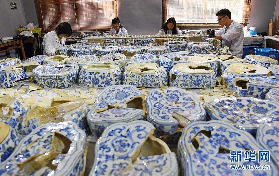 在江西景德镇御窑厂遗址,工作人员在修复明代瓷枕(2018年9月20日摄)。新华社记者 万象 摄