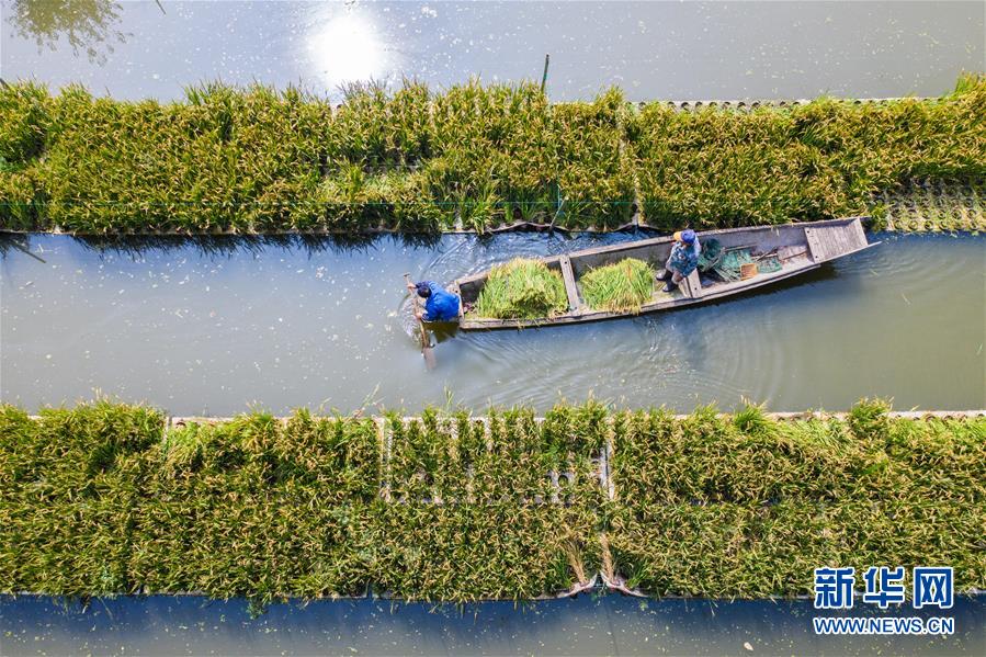 10月10日,东林镇秋粮家庭农场工作人员把收割好的水上无土栽培水稻用船运回岸边(无人机拍摄)。新华社记者 徐昱 摄