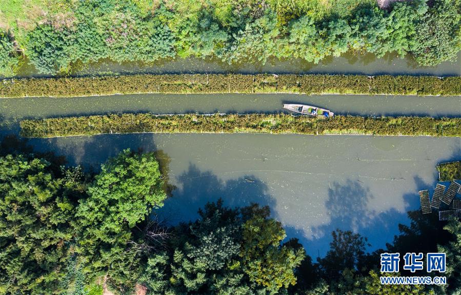 10月10日,东林镇秋粮家庭农场工作人员正在收割水上无土栽培水稻(无人机拍摄)。新华社记者 徐昱 摄