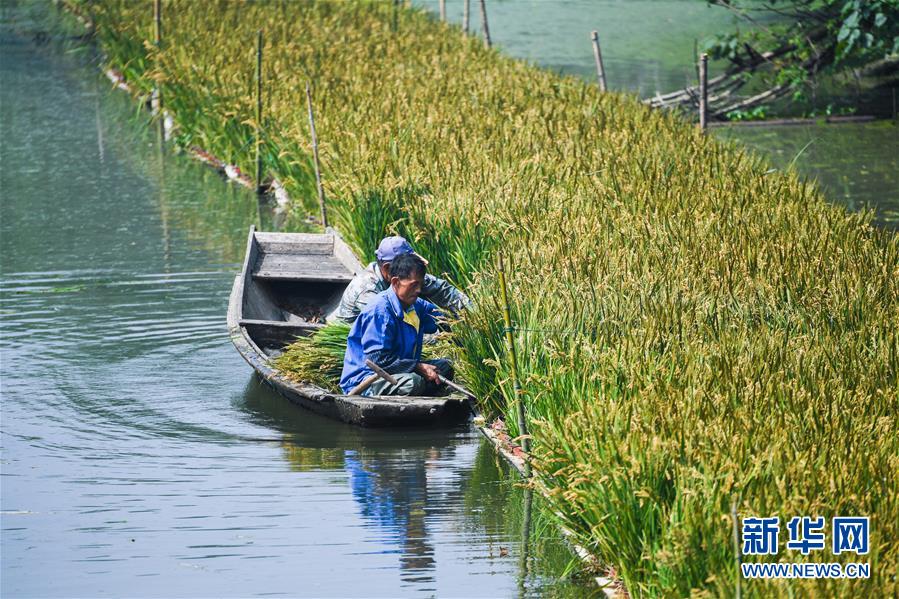 10月10日,东林镇秋粮家庭农场工作人员正在收割水上无土栽培水稻。新华社记者 徐昱 摄