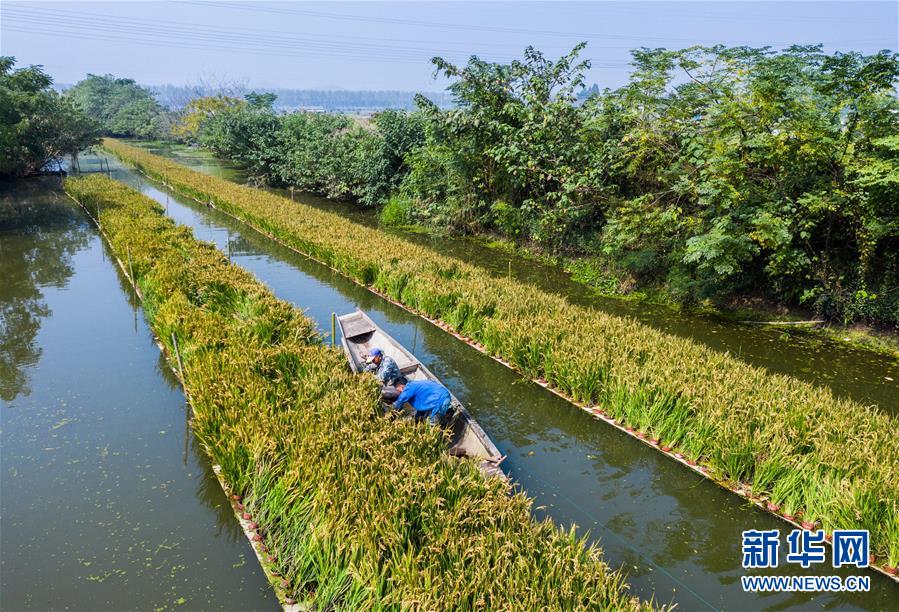 10月10日,东林镇秋粮家庭农场工作人员正在收割水上无土栽培水稻(无人机拍摄)。新华社记者 徐昱 摄