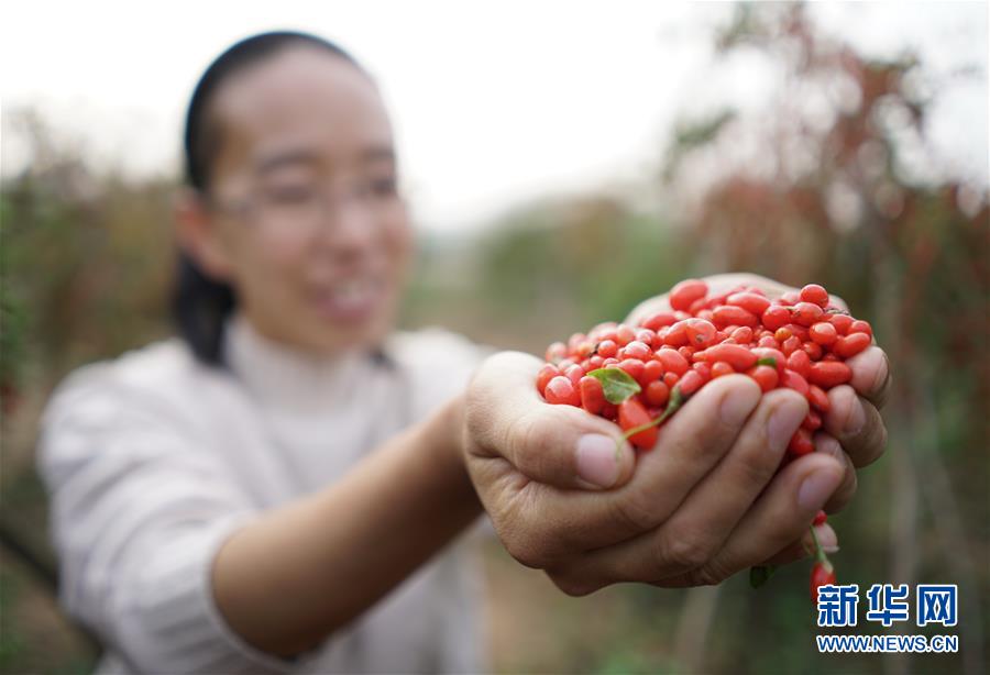 10月10日,河北省巨鹿县堤村乡孔寨村农民在展示采摘的枸杞。 近日,河北省巨鹿县种植的枸杞陆续进入秋季成熟期,农户抓紧农时采摘。目前,该县枸杞种植面积达6.5万亩,年产值超10亿元。 新华社记者 牟宇 摄