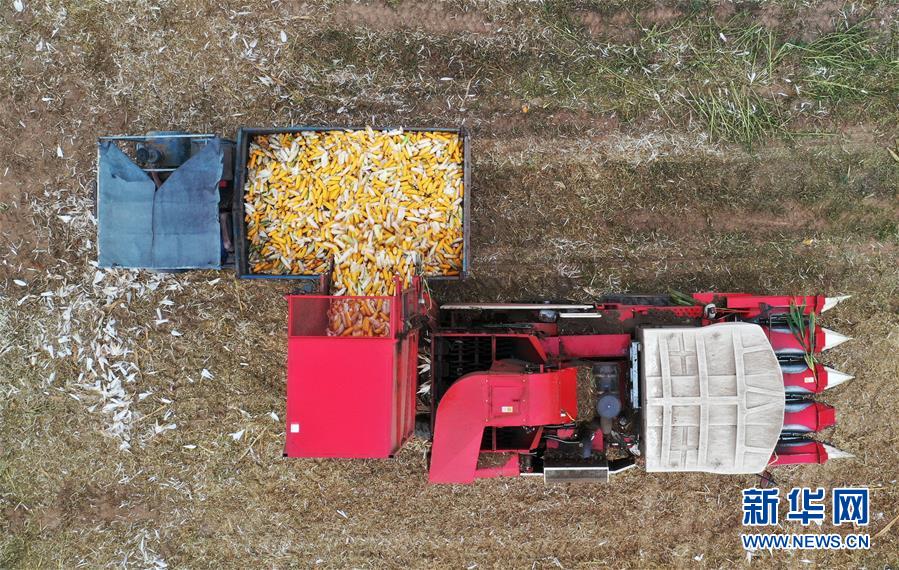 10月10日,雄安新区容城县郭村的农民在收获玉米(无人机拍摄)。 目前,正值河北雄安新区玉米成熟的时节,农民们抢抓农时,收获秋粮。 新华社记者 邢广利 摄