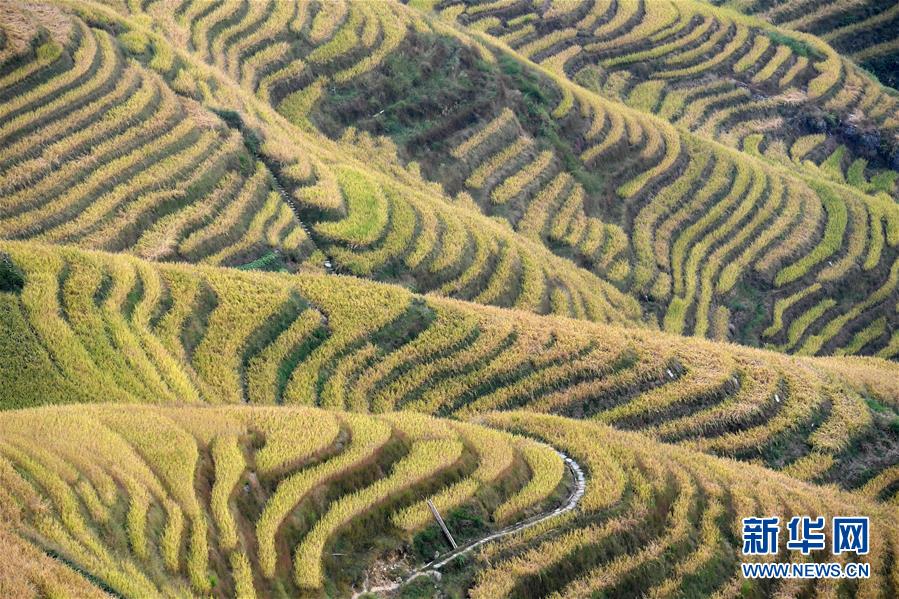 这是10月10日在广西龙胜各族自治县拍摄的龙脊梯田。 眼下,广西龙胜各族自治县正值收获季节,龙脊梯田在阳光映照下,风景如画。 新华社记者陆波岸摄