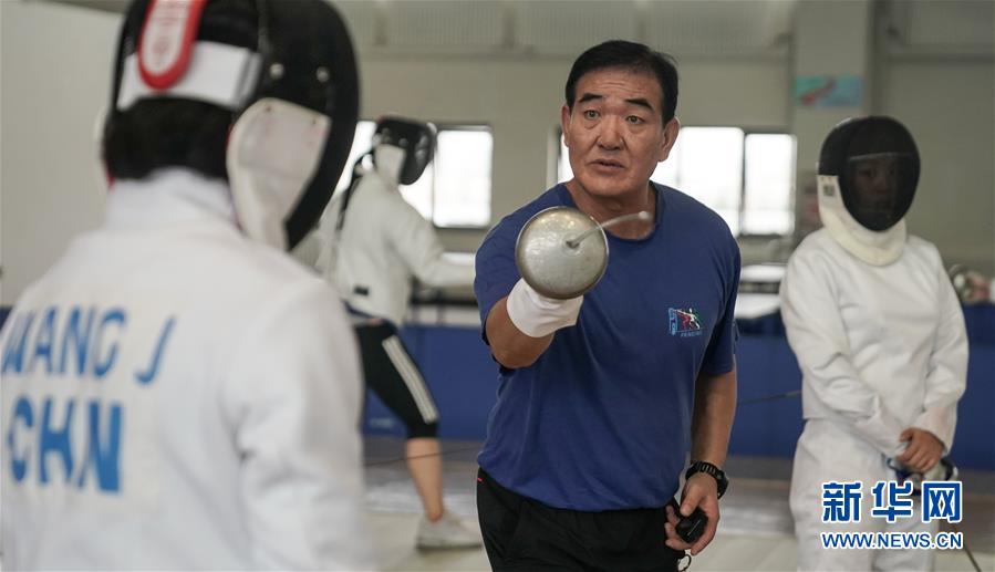 教练孙琦(中)在指导八一空军五项队队员进行击剑训练。(8月6日摄)新华社记者 程敏 摄