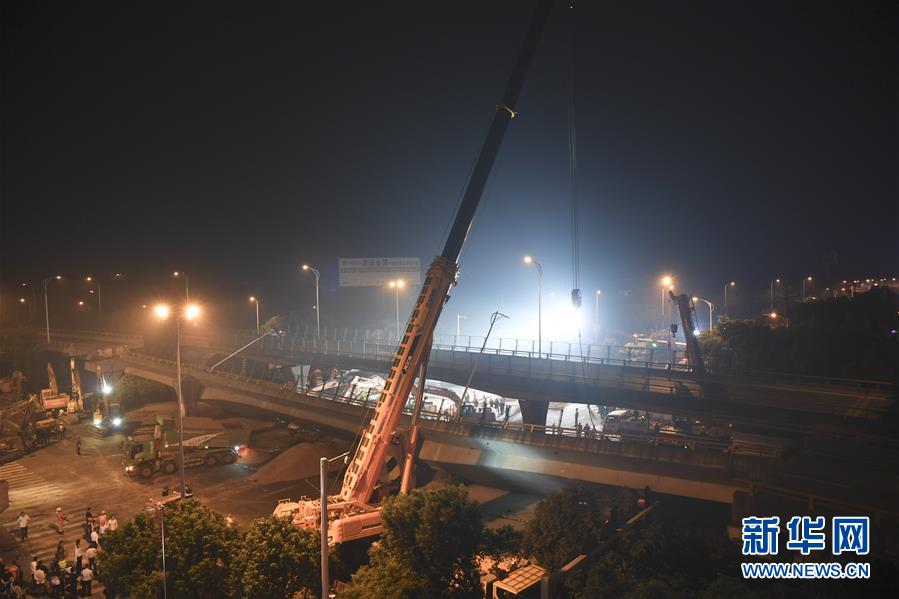 这是10月11日拍摄的事故现场。 10月10日傍晚,江苏省无锡市一高架桥桥面发生侧翻事故,三辆小车被压。 据无锡市公安局锡山分局发布的信息,10日18时10分左右,312国道上海方向K135处、无锡市锡港路上跨桥出现桥面侧翻,经现场初步勘测,桥下被压小车3辆(其中一辆系停放车辆,无人)。 10日晚23时,记者在现场看到,侧翻的桥面有数十米长,一辆拉着钢材的大货车仍停留在侧翻的桥面上。现场救援人员正在紧急破拆侧翻的桥面。 新华社记者 李博 摄