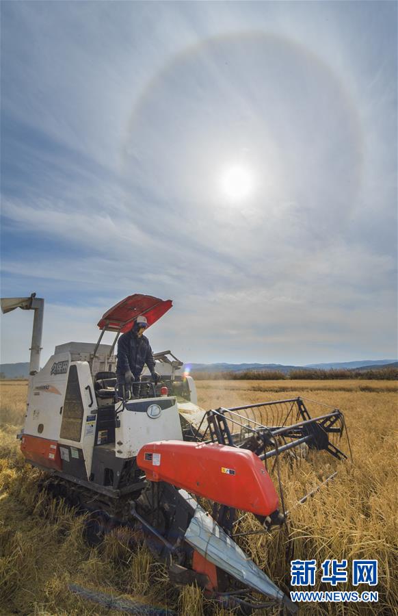 在吉林省和龙市光东村稻田里,农民驾驶收割机收获成熟的水稻(10月10日摄)。 金秋时节,稻谷飘香,吉林省延边朝鲜族自治州进入水稻收获季,田间地头金黄遍野,稻浪滚滚,一派丰收景象。 新华社记者 许畅 摄