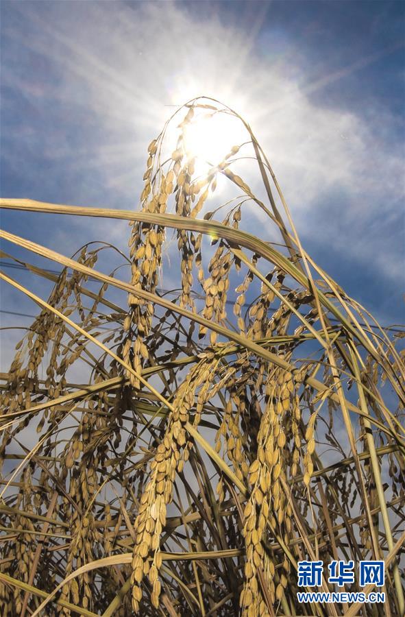 这是10月10日在吉林省和龙市光东村拍摄的成熟的稻穗。 金秋时节,稻谷飘香,吉林省延边朝鲜族自治州进入水稻收获季,田间地头金黄遍野,稻浪滚滚,一派丰收景象。 新华社记者 许畅 摄