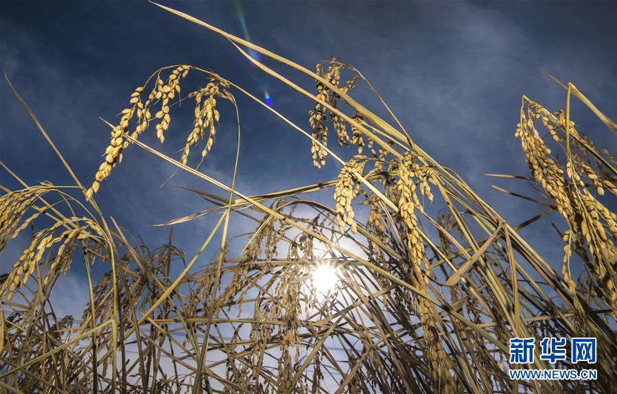 这是10月10日在吉林省和龙市光东村拍摄的成熟的稻穗。 金秋时节,稻谷飘香。吉林省延边朝鲜族自治州进入水稻收获季,田间地头金黄遍野,稻浪滚滚,一派丰收景象。 新华社记者 许畅 摄