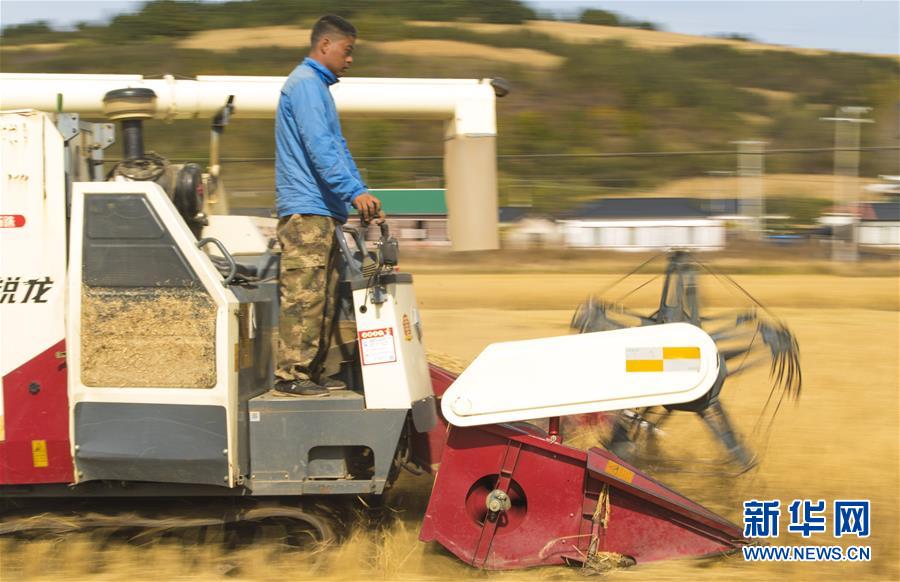 在吉林省和龙市光东村稻田里,农民驾驶收割机收获成熟的水稻(10月10日摄)。 金秋时节,稻谷飘香。吉林省延边朝鲜族自治州进入水稻收获季,田间地头金黄遍野,稻浪滚滚,一派丰收景象。 新华社记者 许畅 摄
