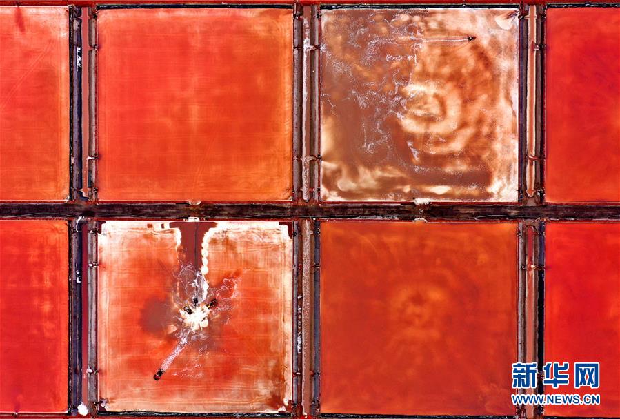 鲁北盐场工人在盐池中收获海盐(10月9日无人机拍摄)。新华社记者 朱峥 摄