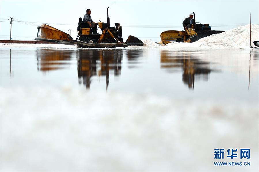 鲁北盐场工人在盐池中收获海盐(10月9日摄)。新华社记者 朱峥 摄
