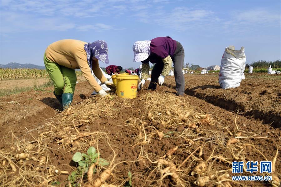 10月12日,在威海市文登区高村镇,参农在收获西洋参。 金秋时节,山东省威海市文登区西洋参喜获丰收。文登区自20世纪80年代初开始引种西洋参,目前种植面积稳定在5.5万亩左右。西洋参种植成为带动当地群众增收致富的特色产业。 新华社记者郭绪雷摄