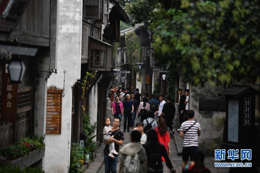 10月12日,游客在乌镇景区游览。 时值深秋,各地游客来到浙江省桐乡市乌镇赏景游玩。 新华社记者 黄宗治 摄