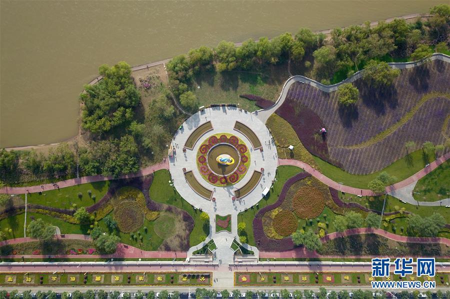 这是10月12日在兰州市城关区黄河岸边拍摄的兰州马拉松公园秋景(无人机拍摄)。新华社记者 范培珅 摄