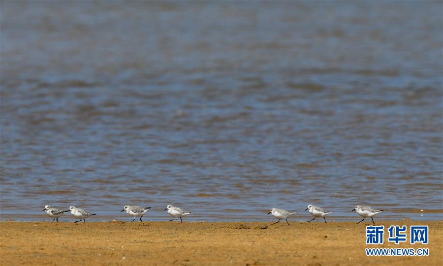 10月12日,一群三趾滨鹬在光村银滩的滩涂上觅食。新华社记者 杨冠宇 摄