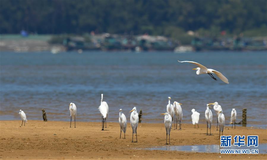 10月12日,一群鹭鸟在光村银滩的滩涂上休憩。新华社记者 杨冠宇 摄