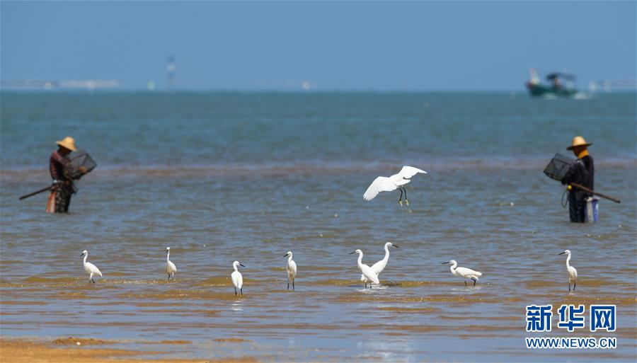 10月12日,一群鹭鸟在光村银滩的滩涂上觅食。新华社记者 杨冠宇 摄