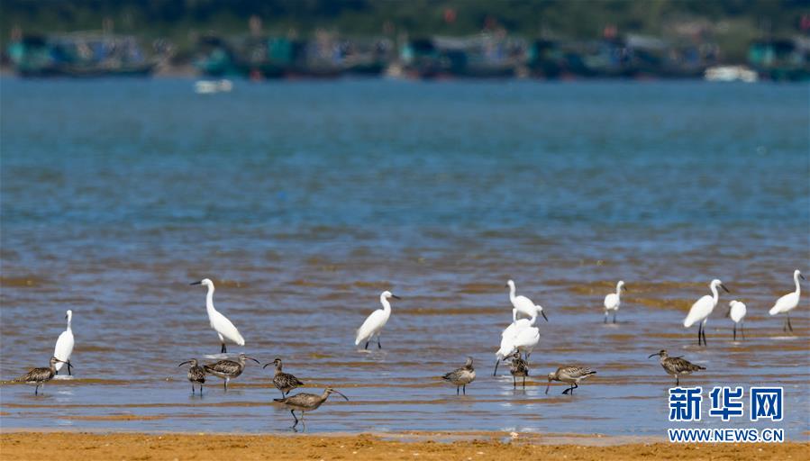 10月12日,一群鹭鸟和中杓鹬在光村银滩的滩涂上觅食。新华社记者 杨冠宇 摄