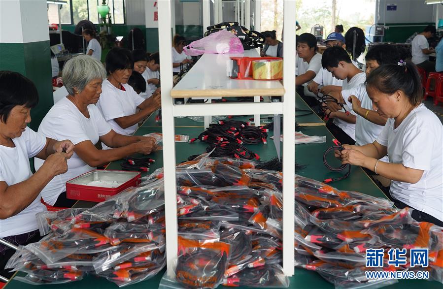 在江西省鹰潭市余江区平定乡沙溪村海清电子扶贫车间,村民在加工一批数据线产品(10月12日摄)。 新华社记者万象摄