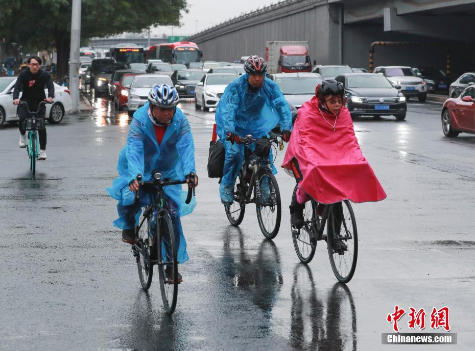 10月13日,北京迎降雨降温天气。图为市民冒雨出行。中新社记者 贾天勇 摄