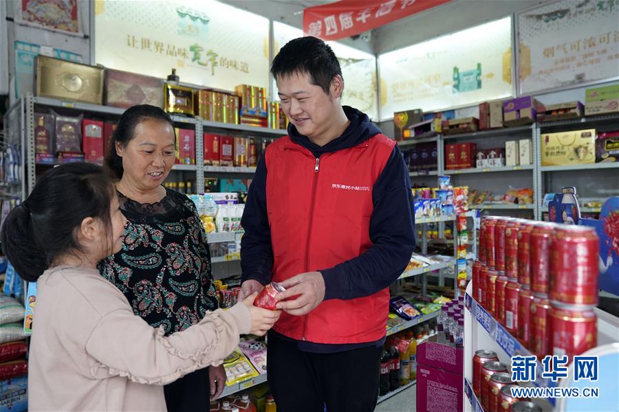 10月13日,顾客在四川省崇州市廖家镇一家惠民小站选购金川雪梨汁。 四川省阿坝藏族羌族自治州金川县,位于青藏高原东部边缘,不少当地人以种植雪梨为生。由于金川地处偏远,在运输道路与销售思路双双没有打开的情况下,金川雪梨渐渐失去市场竞争力,一度滞销。2018年12月起,京东数字科技从品牌包装、物流运输、打造产品生态圈等方面入手,帮助当地建立起“产品+旅游”双管齐下的雪梨产业链,结满树梢的雪梨制成雪梨汁、雪梨膏、雪梨糖和雪梨果酒等产品,并在全国各乡镇的惠民小站推广销售。 新华社记者 金良快 摄