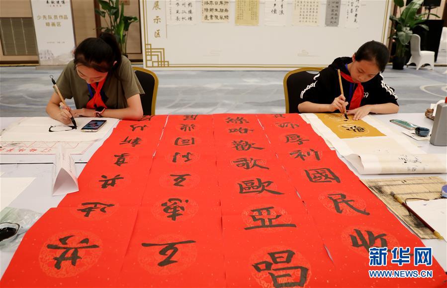 10月13日,两名学生在笔会上创作。 当日,“献礼祖国,奉献进博”主题笔会在位于国家会展中心(上海)内的国家会议中心举行。知名书画艺术家、老将军代表以及100名具备书画特长的中小学生代表参加笔会并现场创作。据介绍,此次笔会创作的艺术作品,将列入进博会后的延展内容,搭建“进博艺术长廊”,让参观市民都能领略中华文化的风采。 新华社记者 方喆 摄