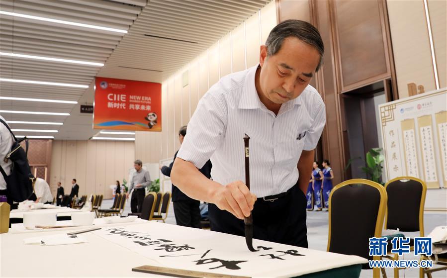 10月13日,一位书法家在笔会现场创作。 当日,“献礼祖国,奉献进博”主题笔会在位于国家会展中心(上海)内的国家会议中心举行。知名书画艺术家、老将军代表以及100名具备书画特长的中小学生代表参加笔会并现场创作。据介绍,此次笔会创作的艺术作品,将列入进博会后的延展内容,搭建“进博艺术长廊”,让参观市民都能领略中华文化的风采。 新华社记者 方喆 摄