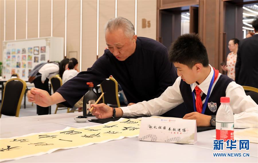 10月13日,一位老书法家在笔会现场指导一名学生。 当日,“献礼祖国,奉献进博”主题笔会在位于国家会展中心(上海)内的国家会议中心举行。知名书画艺术家、老将军代表以及100名具备书画特长的中小学生代表参加笔会并现场创作。据介绍,此次笔会创作的艺术作品,将列入进博会后的延展内容,搭建“进博艺术长廊”,让参观市民都能领略中华文化的风采。 新华社记者 方喆 摄