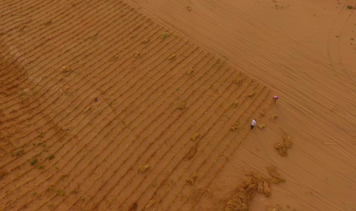 图为航拍的工作人员在沙地上扎草方格(10月11日摄)。