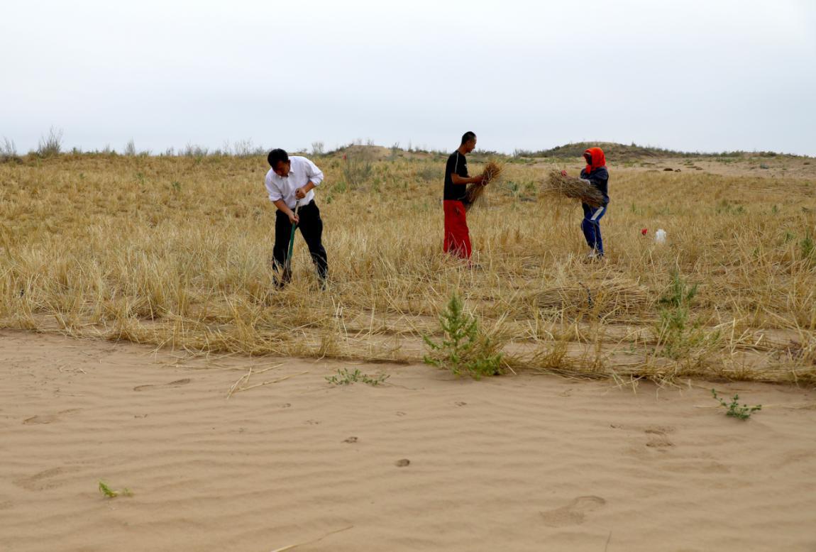 10月11日,在宁夏灵武白芨滩国家级自然保护区,“人民楷模”国家荣誉称号获得者、保护区管理局原党委书记、局长王有德(左)在治沙一线扎草方格。(杜文杰 张洁龙)