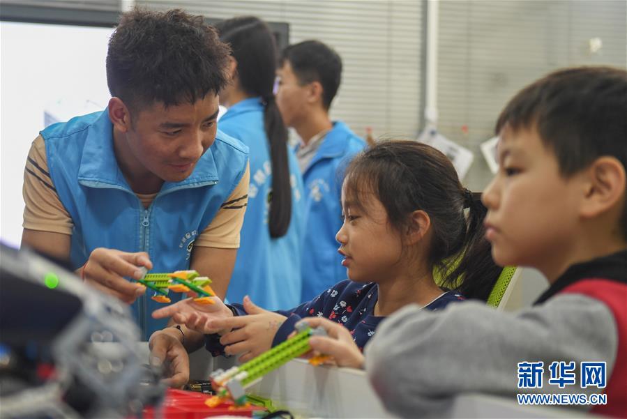 在位于陕西咸阳的西藏民族大学,“智慧星机器人教育”大学生创业项目成员益西嘉措(前左)在辅导小学员搭建模型(10月11日摄)。 新华社记者 李键 摄