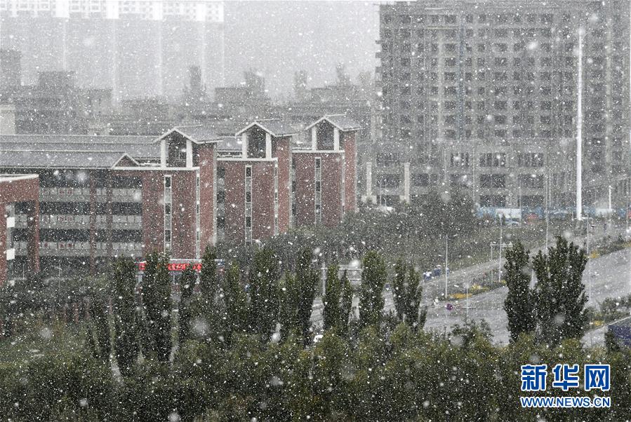 这是在银川市街头拍摄的雪景(10月14日摄)。 当日,宁夏银川市迎来降雪天气。宁夏气象台发布暴雪蓝色预警,提醒市民注意交通安全、做好防寒、防滑和清雪工作。 新华社记者 王鹏 摄