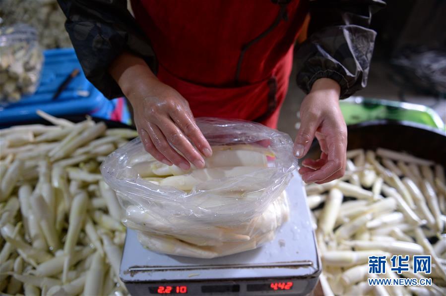 10月14日,余畈村居民给茭白称重包装。 近年来,安徽省岳西县主簿镇余畈村大力发展高山茭白产业,采取“合作社+农户”的模式,全村1300亩水田全部种植高山茭白,亩均产值达7500元,是村民的主要经济来源之一。 新华社发(黄博涵摄)