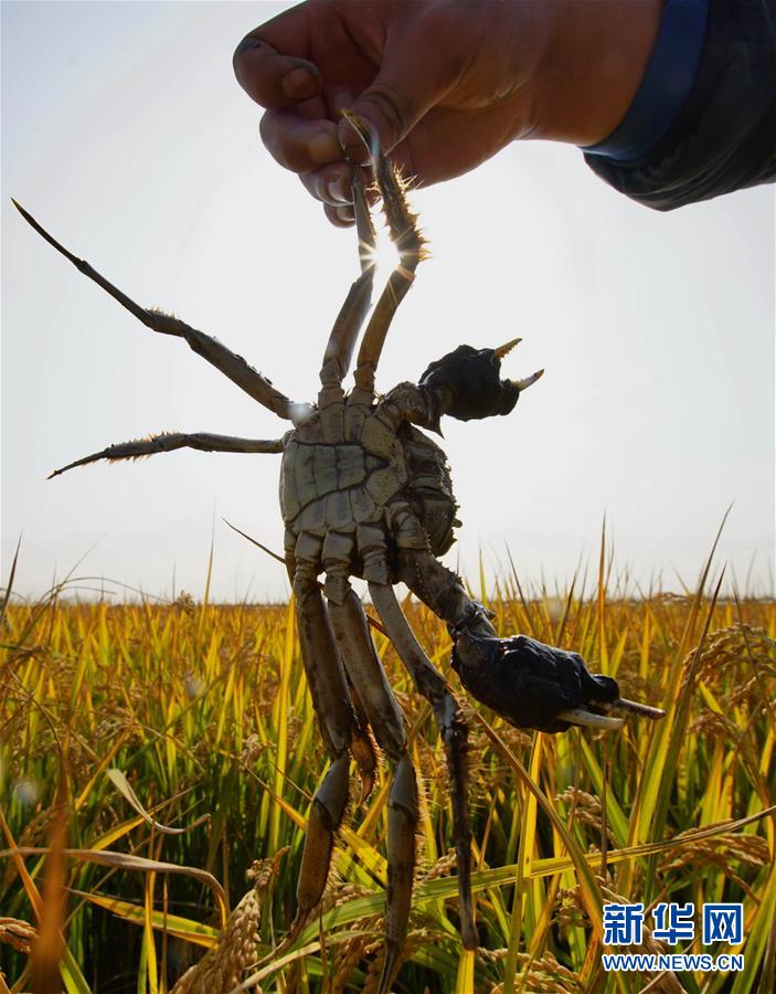 10月14日,唐山市曹妃甸区一农场的农民展示刚捕捞的稻田蟹。 金秋时节,河北省唐山市曹妃甸区农民抢抓农时收割水稻、捕捞稻田蟹,一派繁忙景象。今年该区水稻种植面积32万亩,其中稻蟹立体种养面积达5.5万亩。 新华社记者 杨世尧 摄