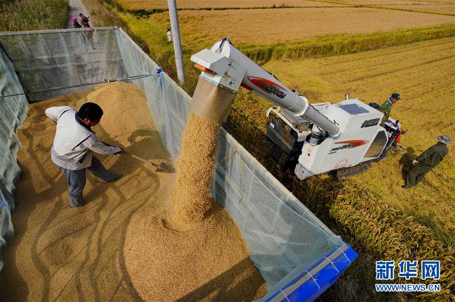 10月14日,唐山市曹妃甸区一农场的农民在收获水稻(无人机拍摄)。 金秋时节,河北省唐山市曹妃甸区农民抢抓农时收割水稻、捕捞稻田蟹,一派繁忙景象。今年该区水稻种植面积32万亩,其中稻蟹立体种养面积达5.5万亩。 新华社记者 杨世尧 摄