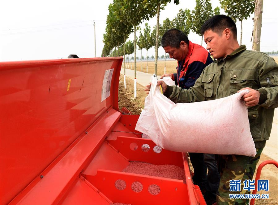 10月15日,南和县闫里乡金沙河农作物种植专业合作社农民将小麦种子倒入播种机。 金秋时节,河北省南和县农民抓住有利时机播种小麦,确保不误农时。 新华社记者 朱旭东 摄