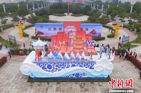 10月15日,“金色赣鄱”江西彩车亮相南昌市红谷滩新区行政广场,并进行了首场汇报展演,吸引了众多市民和游客围观、拍照。彩车底部的如意造型,点缀景德镇的青花吉祥纹样和青花瓷地毯,布置汤显祖的《牡丹亭》戏曲表演,在井冈山造型的超大立体异形LED显示屏上,通过LED大屏幕循环播放红色、古色、绿色、金色江西的视频内容,与车上人物造型表演、机器人表演、VR标识造型相得益彰,展示了江西传承红色基因、厚植古色文化、加快绿色崛起、汇聚金色发展的勃勃生机。